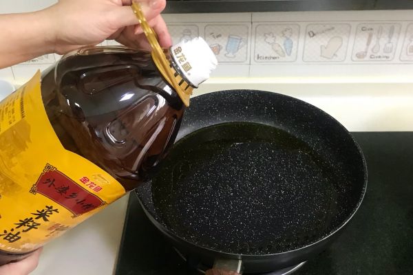 6、开大火,往锅内倒入适量的金龙鱼外婆乡小榨菜籽油。
